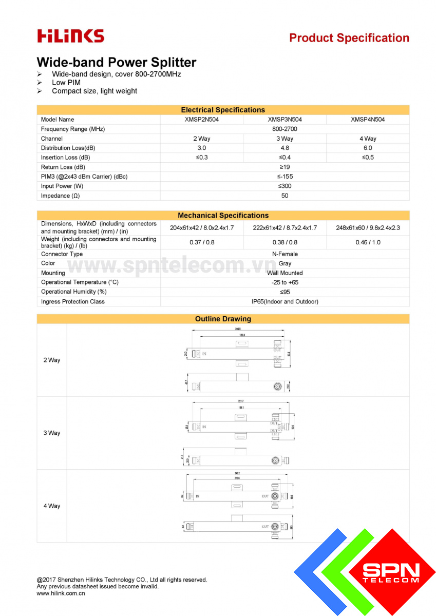 Công ty SPN Telecom chuyên phân phối các sản phẩm Bộ chia Power Splitter 2,3,4 way, chính hãng với số lượng lớn. Đặt hàng nhanh trong ngày, giá cả tốt nhất thị trường.