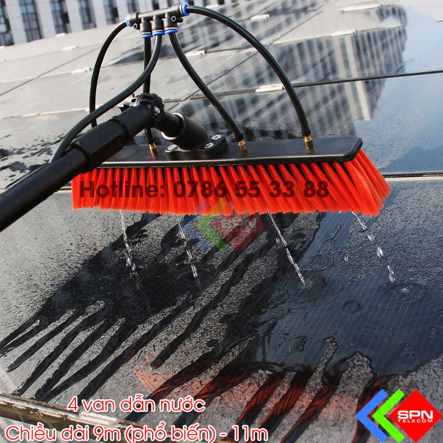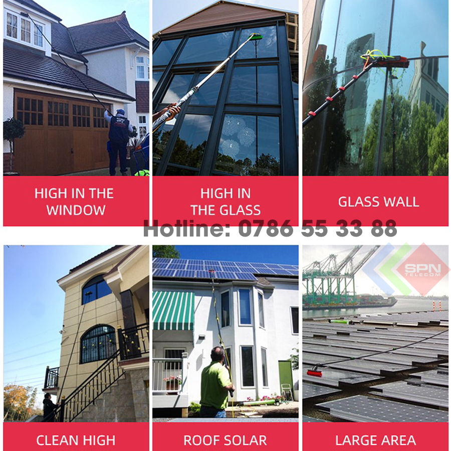 + Chổi đa dạng kích cỡ (7.2m, 9m, 11m), khách hàng mua phổ biến là loại cán dài 9 m có thể rút ra rút vào tiện lợi, dùng kết hợp máy bơm nước để vệ sinh tấm pin mặt trời, vệ sinh tấm kính cửa sổ tiện lợi.