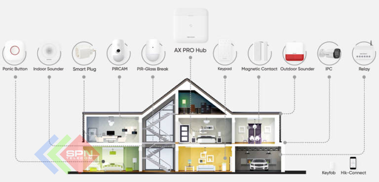 Bộ thiết bị có thể kết hợp với các loại cảm biến khói, cảm biến chuyển động cho phép cảnh báo trước các tình huống như trộm đột nhập, báo cháy hỏa hoạn, rò rỉ khí gas… kết hợp với App quản lý cài đặt trên smartphone Android hay iOS SPN Smart, người dùng có thể điều khiển từ xa.