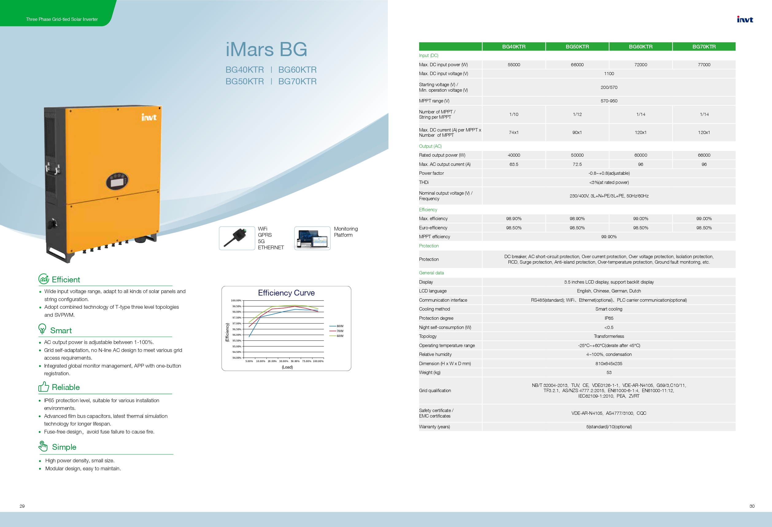 Bộ Inverter iMars BG được ứng dụng phổ biến cho tòa nhà thương mại và các nhà máy điện. Sản phẩm có thiết kế bắt mắt, giao diện thân thiện, dễ cài đặt, bảo trì và tiết kiệm chi phí. Dòng BG 3 pha được phát triển trên nền tảng công nghệ Đức, hoạt động ổn định với hiệu suất tối đa lên đến 99%.
