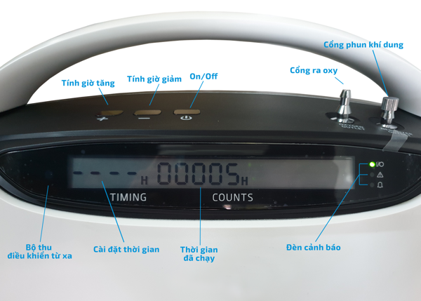 - Trên bảng điều khiển gồm bộ thu điều khiển từ xa, màn hình LCD hiển thị thông số giúp người dùng kiểm soát lưu lượng khí thở, thời gian sử dụng thiết bị,... Trên thân máy có lưu lượng kế để đo nồng độ khí oxy được tạo ra mỗi phút và nút điều chỉnh lưu lượng