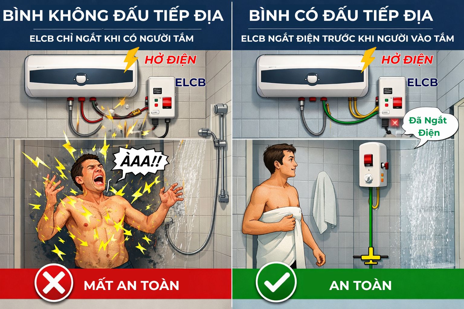 Bình nóng lạnh nguy co gây giật nếu bộ chống giật ELCB không có chân đấu tiếp địa an toàn