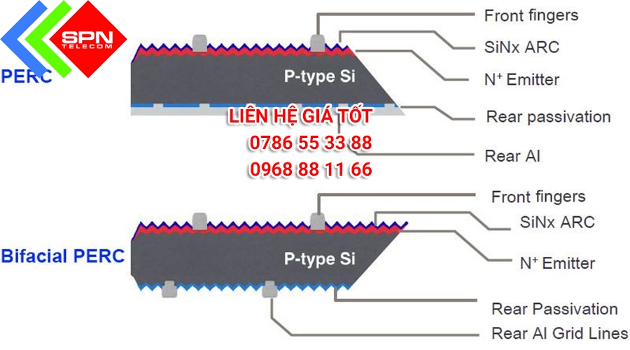 – Bifacial PERC có tất cả ưu điểm của công nghệ PERC. Bằng cách thay đổi quy trình in của tế bào PERC một mặt và thay đổi bề mặt phía sau từ toàn bộ lớp nhôm sang lớp nhôm cục bộ. Điều này cho phép ánh sáng ngẫu nhiên ở bề mặt phía sau đi vào tế bào từ lớp tiếp xúc và tạo ra sự chuyển đổi quang điện ở cả phía trước và phía sau.