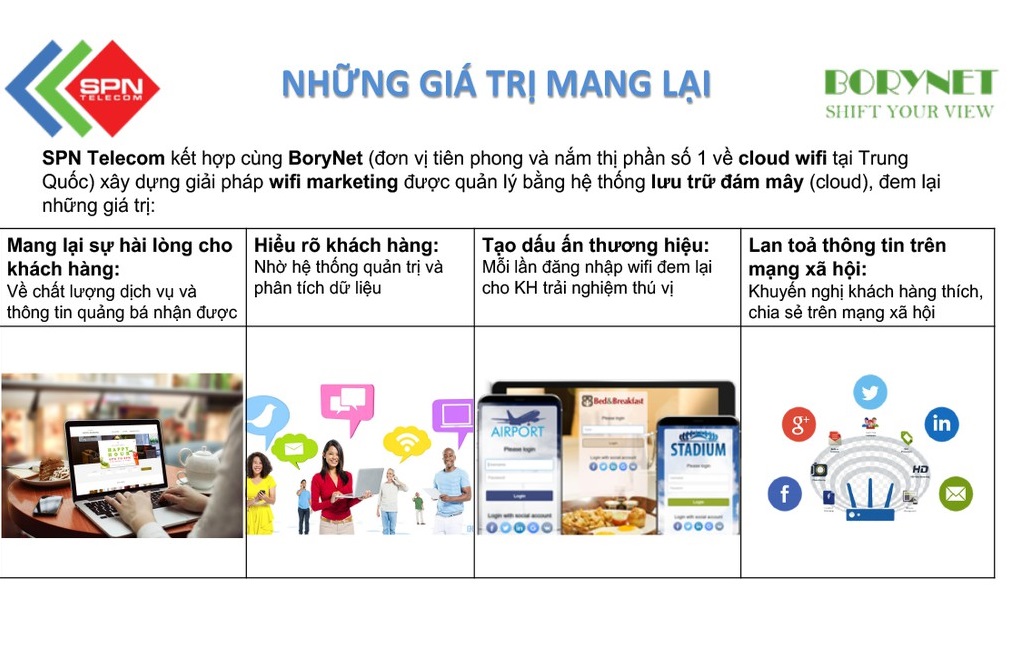 Wifi Marketing - Giải pháp quảng bá thương hiệu hoàn hảo với chi phí cực thấp. Với hệ thống mạng internet FTTH/ADSL hiện có, bạn hoàn toàn có thể thiết lập một phương thức quảng cáo mới, hoàn toàn miễn phí (với sự hỗ trợ của chúng tôi - SPN Telecom). Sản phẩm chính hãng Borynet (top 3 wifi tại Trung Quốc cùng TP Link và Tenda) được phân phối chính thức bởi Công ty Cổ phần Giải pháp và Dịch vụ Viễn thông SPN Telecom.